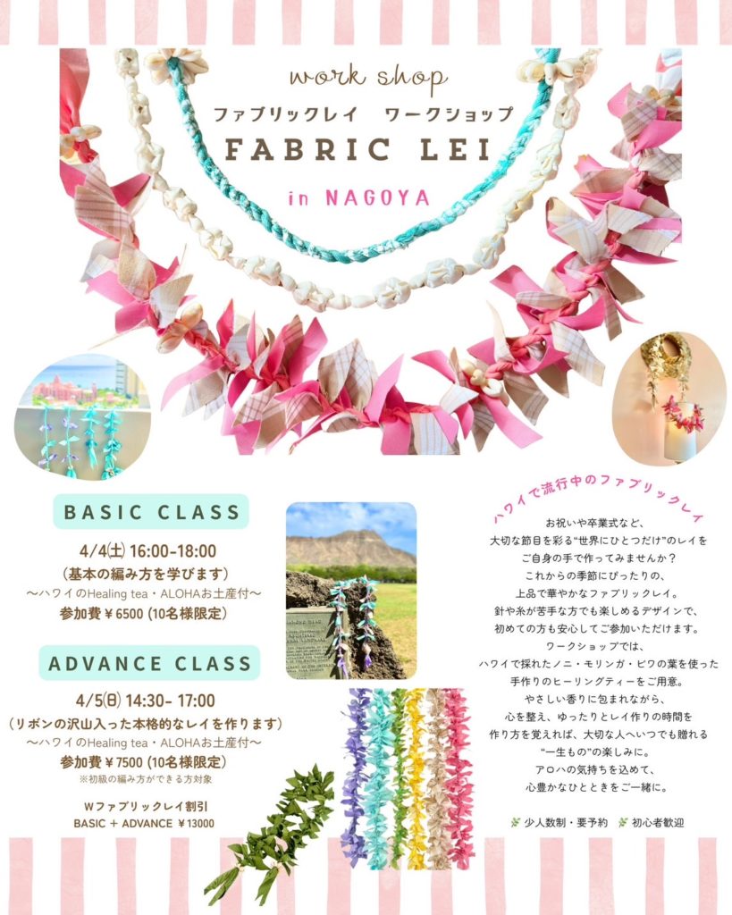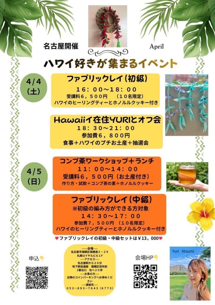 名古屋でハワイの風を感じながら、ファブリックレイ作りやコンブチャなどのワークショップを通して、今ハワイで人気のことや最新情報もいち